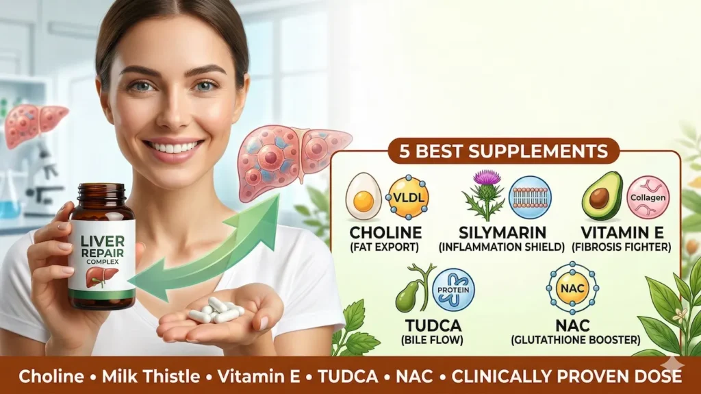 The 5 best supplements for liver health backed by 2026 clinical data are Choline (to export fat), Phytosomal Silymarin (to reduce inflammation), Vitamin E (to fight fibrosis), TUDCA (to support bile flow), and NAC (to boost glutathione).
